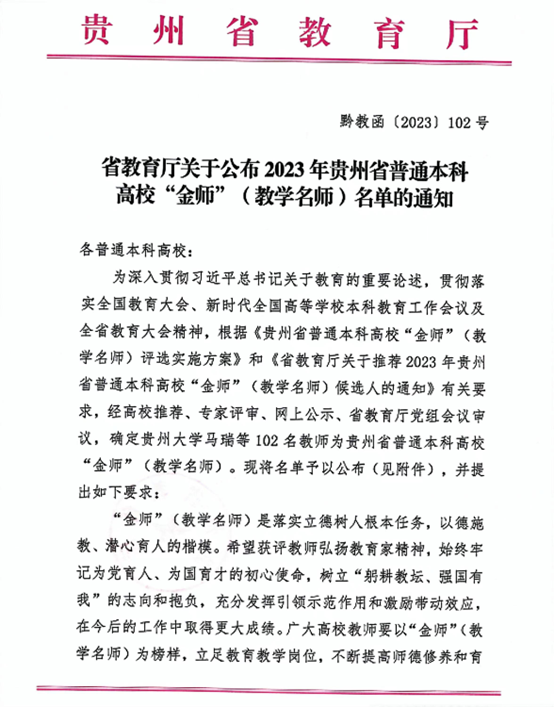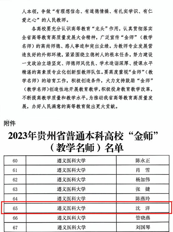 近期,贵州省教育厅公布2023年贵州省普通本科高校“金师”(教学名师)评选结果,公司党委委员、副经理沈洋副教授被评选为贵州省普通本科高校“金师”(教学名师),实现公司在省级“金师”(教学名师)培育上的重要突破。