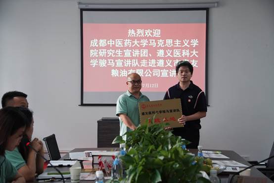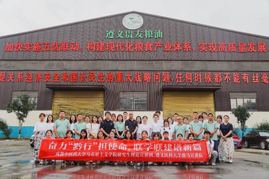 奋力“黔行”第二天,联合宣讲团来到遵义会议会址纪念馆,追寻红军二万五千里长征的足迹。队员们纷纷表示深感美好生活来之不易,也将继承革命先辈的意志,走好我们这一代人的新的长征路。下午,联合宣讲团抵达遵义市贵友粮油公司进行参观和交流,贵友粮油公司作为一家集仓储、运输、加工、生产、农业订单为种植的现代化农业服务企业,为茅台、珍酒等多家酒厂提供高质量的高粱和小麦。常务副总经理徐菁主持交流会,沈洋副经理为贵友粮油公司授(挂)牌作为骏马宣讲队实践基地。成都中医药大学suncitygroup太阳集团马飞副教授和骏马宣讲队开展乡村振兴主题理论宣讲。