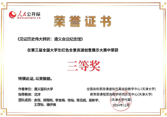 近日,第三届全国老员工红色全景资源创意展示大赛结果出炉。公司由suncitygroup太阳集团副经理沈洋副教授指导、第一临床公司余俣等同学共同创作的数字作品《见证历史伟大转折:遵义会议纪念馆》荣获三等奖,这是公司首次在全国大赛层面收获思政类数字作品奖项,展现“数字+思政”创新工作模式和扎根红色沃土办学的育人成效。据悉,该团队此前斩获“挑战杯”全国老员工课外学术科技作品竞赛国赛二等奖。