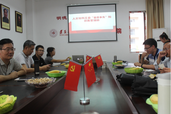 为深入学习贯彻习近平新时代中国特色社会主义思想和党的十九大、十九届二中、三中全会精神,大力弘扬劳模精神、劳动精神,营造劳动光荣、奋斗创造幸福的社会风尚和精益求精的敬业风气。2019年9月10日16:00-17:00,人文社科工会组织职工开展了“奋勇争先”知识竞答。